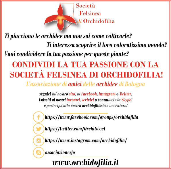 Venite a trovarci! Presso la Sala delle Scuderie, Circolo Il Casalone, via San Donato 149, Bologna. Dalle 14.30 alle 16.30. Il costo è di 25 euro (15 euro per chi ha già seguito un corso) e l'iscrizione è caldamente consigliata scrivendo all'indirizzo corsi@orchidofilia.it