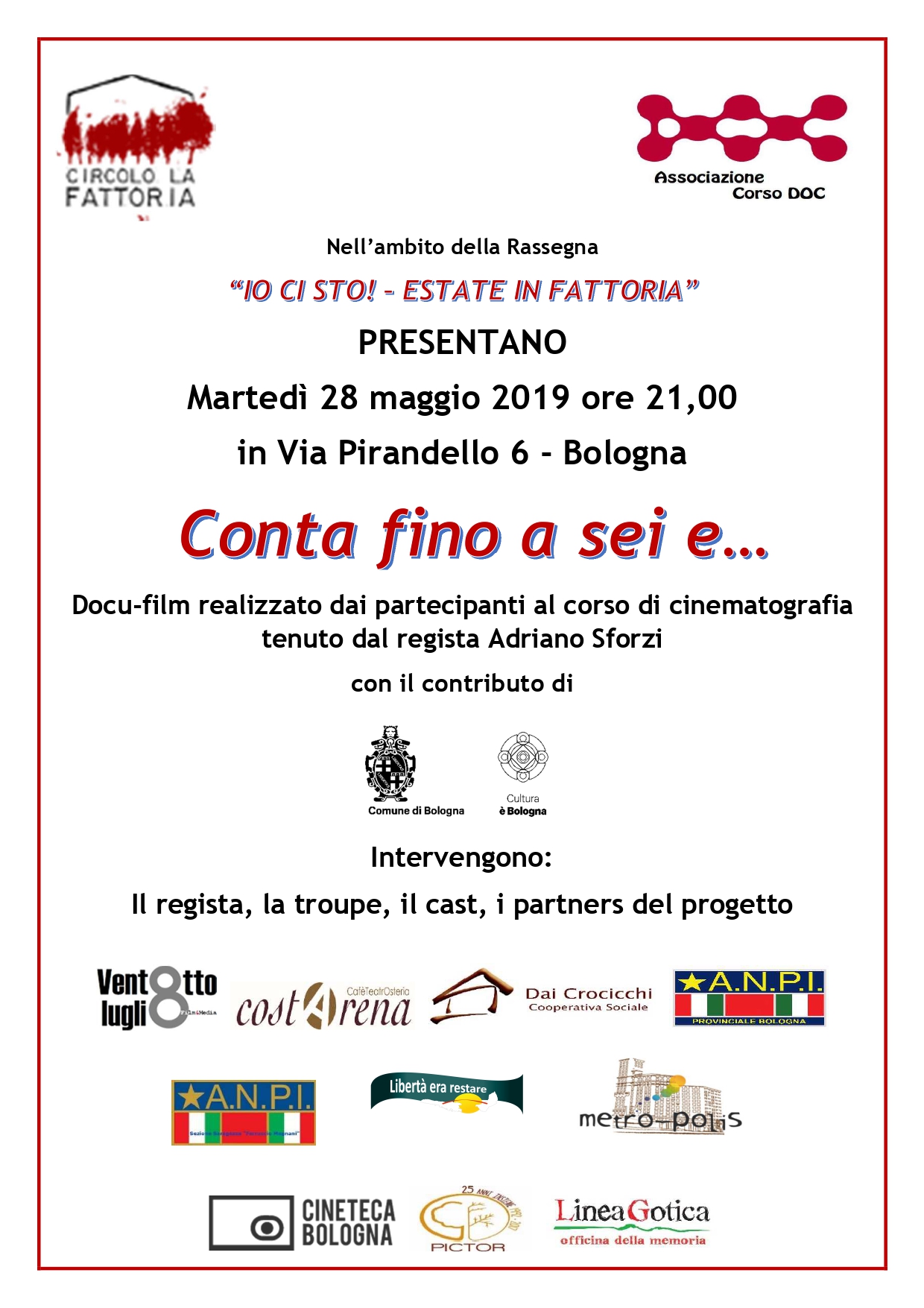 Nell'ambito dellla Rassegna "Io ci sto! - Estate in Fattoria" Associazione Corso Doc-APS presenta, in anteprima assoluta, il film "Conta fino a sei e ..." realizzato dai partecipanti al corso di cinema tenuto dal regista Adriano Sforzi. Tra i partecipanti, anche gli studenti del Liceo Laura Bassi - Corso Doc di Bologna.