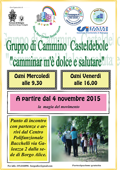 Il Gruppo di Cammino Casteldebole si ritrova ogni mercoledì alle 9,30 e ogni venerdì alle 16,30 nella sede di Borgo Alice in Via Galeazza 2 presso il Centro Polifunzionale Bacchelli.